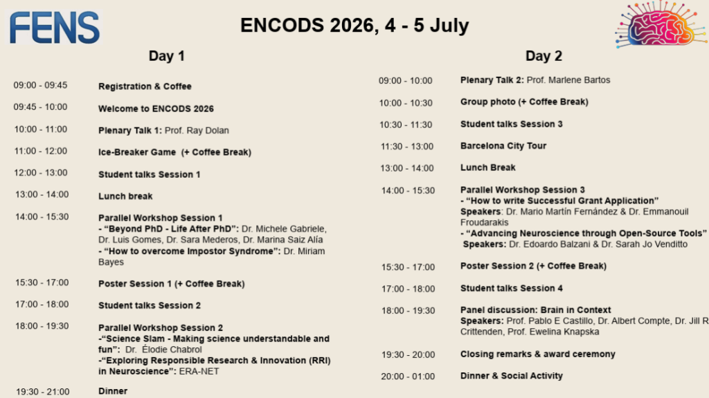 U nastavku vam prosleđujem informaciju o ENCODS 2026 – “Brain in Context” skupu, koji će se održati 4–5. jula 2026. godine u Barseloni pre početka FENS Foruma 2026. U pitanju je događaj namenjen mladim istraživačima iz oblasti neuronauka, sa posebnim fokusom na umrežavanje, mentorsku podršku i razmenu znanja.