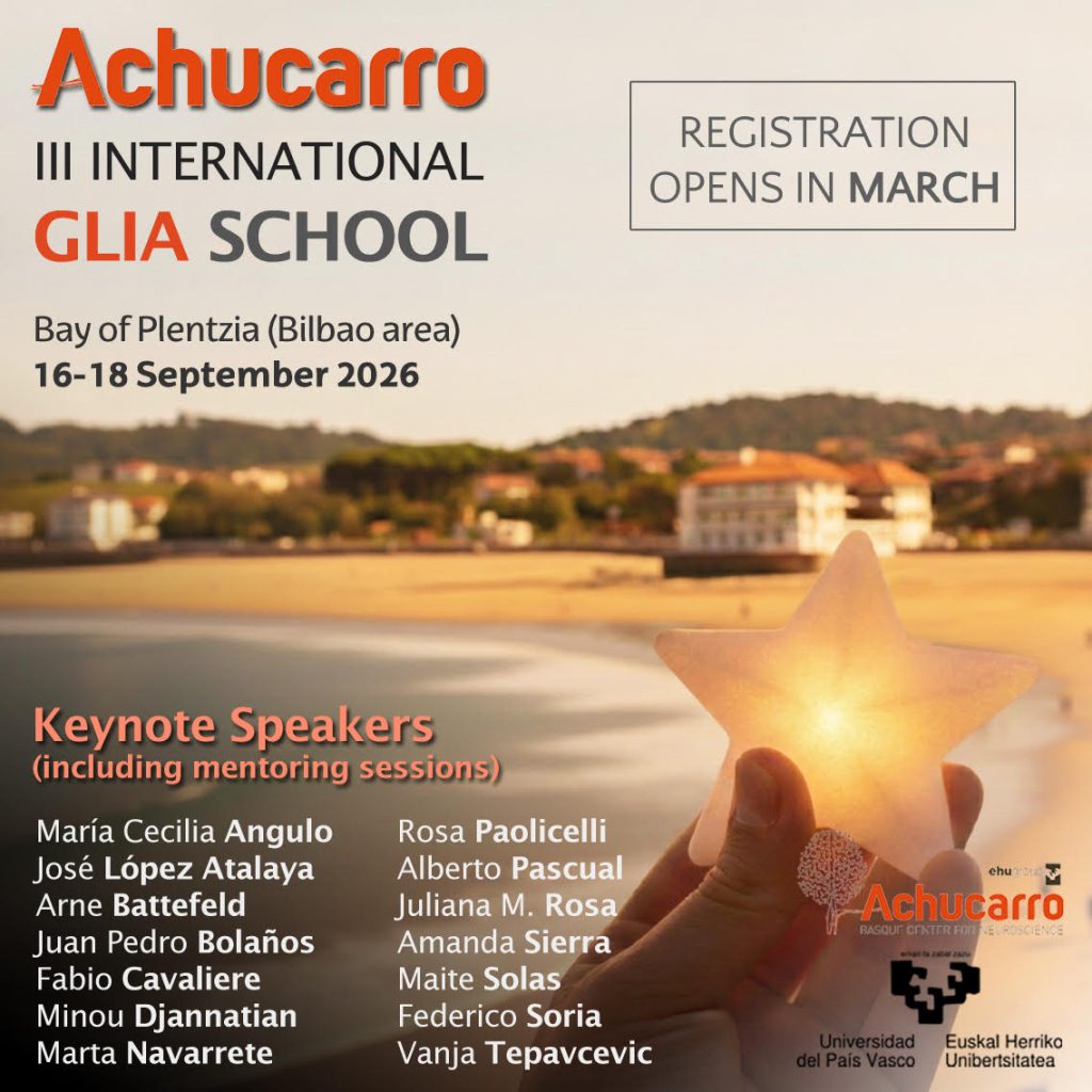 Poštovani članovi, U nastavku prosleđujemo poziv za školu – Achucarro Glia School 2026, Bilbao 16-18. septembar 2026. achucarro.org/glia-school/glia-school-2026/ Deadline for pre-applications: 31 March 2026. All-inclusive tuition (450€) covers scientific sessions, coffee breaks, lunch, social dinner and accommodation (shared rooms) Srdačno, Info grupa DNS